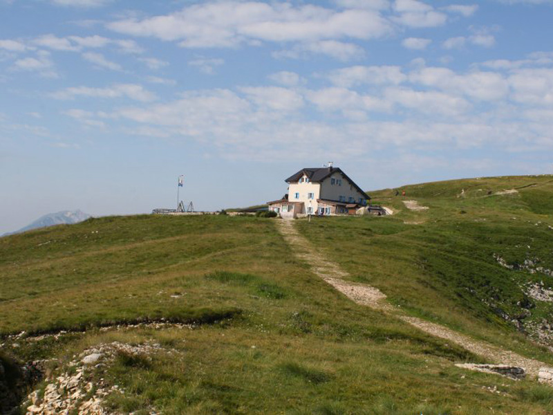 You can ride on the dirt road that follows the asphalted one for a while, but then you have to take your MTB on your shoulders. At the end of this road you can start riding your MTB again until you reach S. Giacomo di Brentonico. Here you find two fountains if you are thirsty and a hotel where you can taste typical dishes of this area. Go ahead following the road signs for San Valentino, a well-known ski resort and then follow the signs for Monte Baldo. At San Valentino Pass you can rest for a while, the road is rather flat but then it leads uphill. The road is asphalted. Cross two tunnels. Going uphill you will see on your left Rifugio Fos-ce, a mountain hut where you can have a break and enjoy the typical dishes of the Trentino tradition. The road runs uphill and reaches Rifugio Graziani. Here you find a dirt road that leads uphill and is partly not cyclable. The climb is worth doing for the wonderful panoramas that include Vallagarina and Lake Garda. On the crest of the mountain there is Rifugio Altissimo Damiano Chiesa, run by the Alpine guide Danny Zampiccoli. In this mountain hut you can refresh yourself and try the typical dishes of the Trentino tradition. From here starts a steep downhill slope that is quite difficult, if you are not an expert we recommend you to push your MTB.