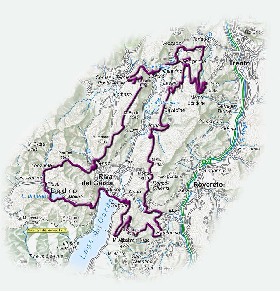 Un percorso tra picchi rocciosi e specchi d’acqua, saliscendi impegnativi e morbidi tratti, alla scoperta dei paesaggi del Garda Trentino, del Monte Bondone e della Valle dei Laghi, del Monte Baldo, di Tremalzo e della Valle di Ledro.